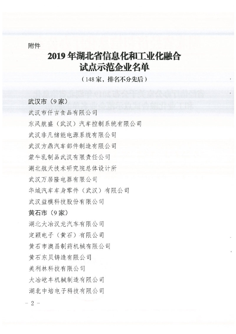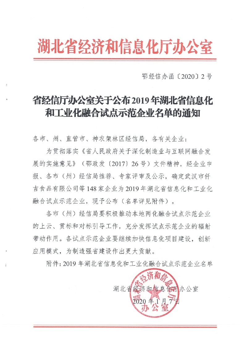 省經(jīng)信廳辦公室關于公布2019年湖北省信息化和工業(yè)化融合試點示范企業(yè)名單的通知